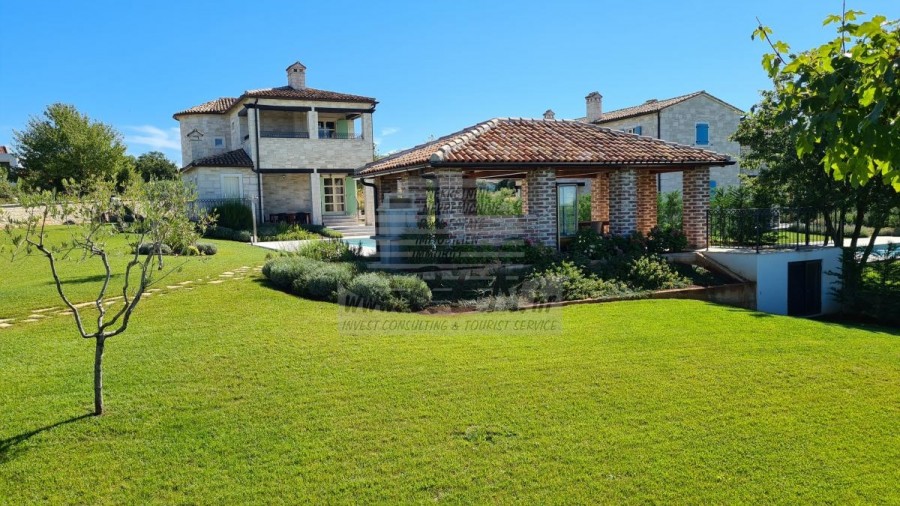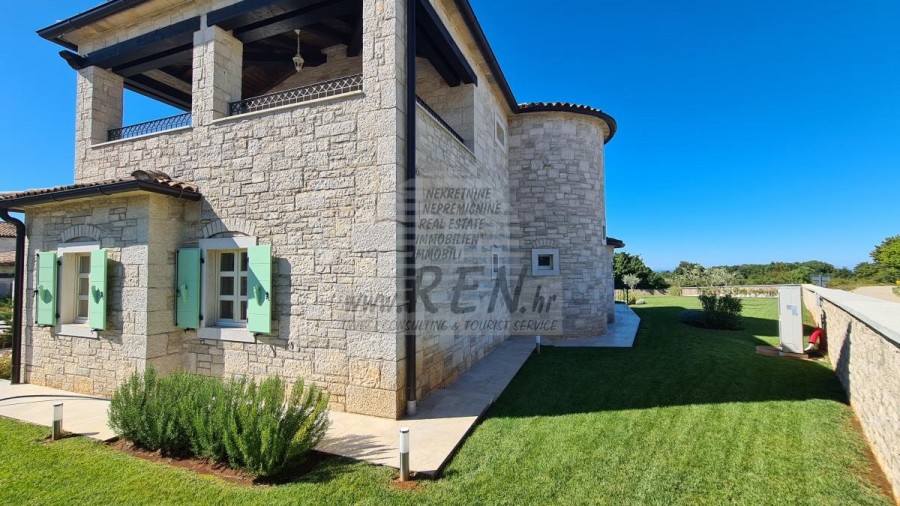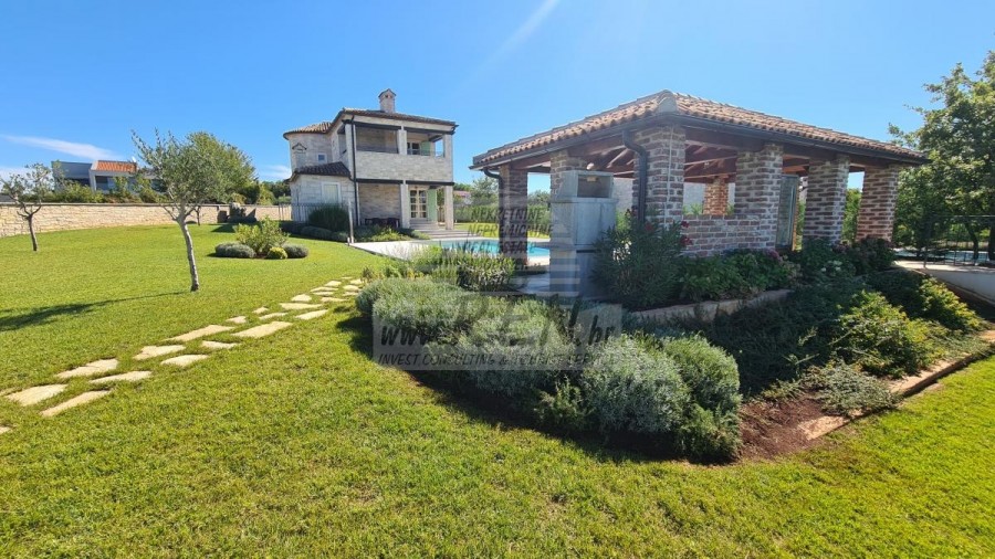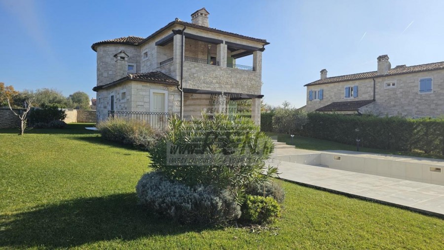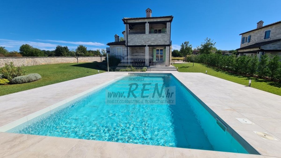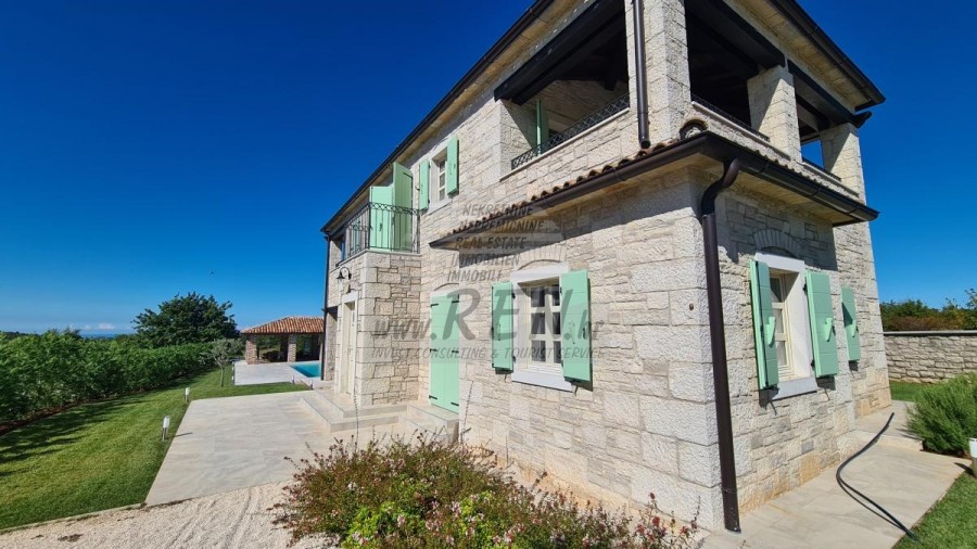 U eksterijeru se nalazi prostrana terasa s bazenom i ljetnom kuhinjom, savršena za tople istarske večeri uz čašu vina i poglede koji se protežu sve do mora. Vila je opremljena podnim i centralnim grijanjem, alarmnim sustavom i privatnim parkingom, te pruža potpunu udobnost tijekom cijele godine.