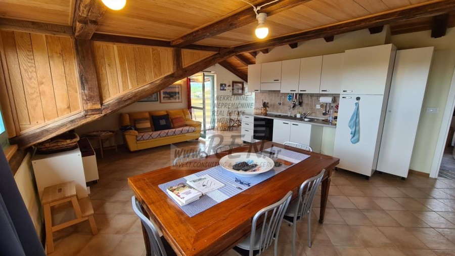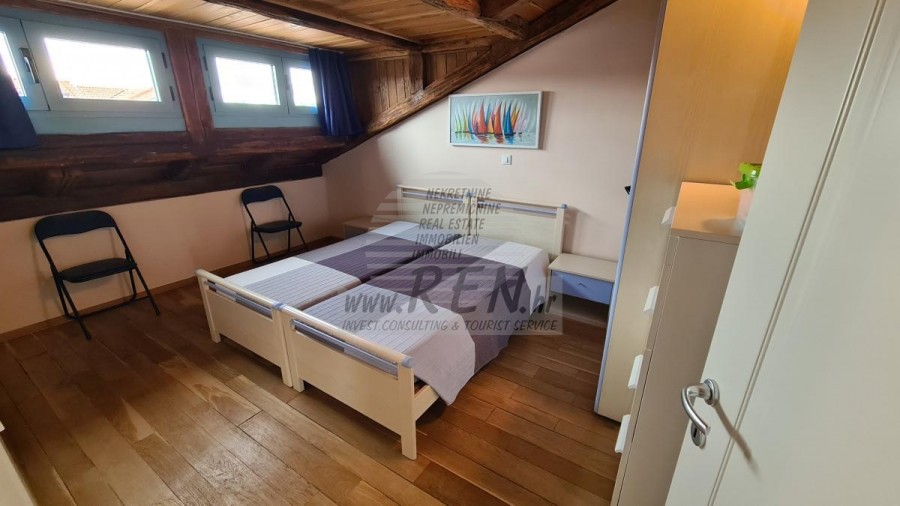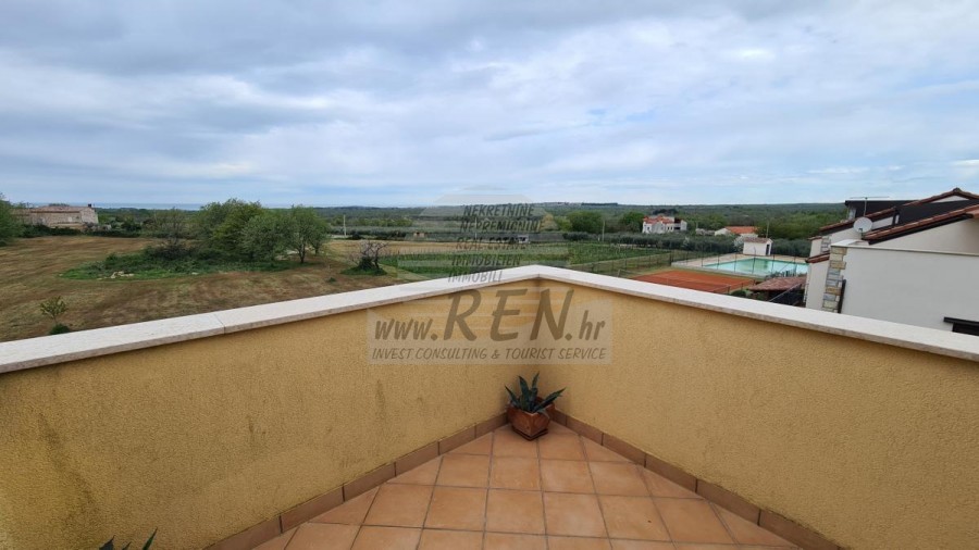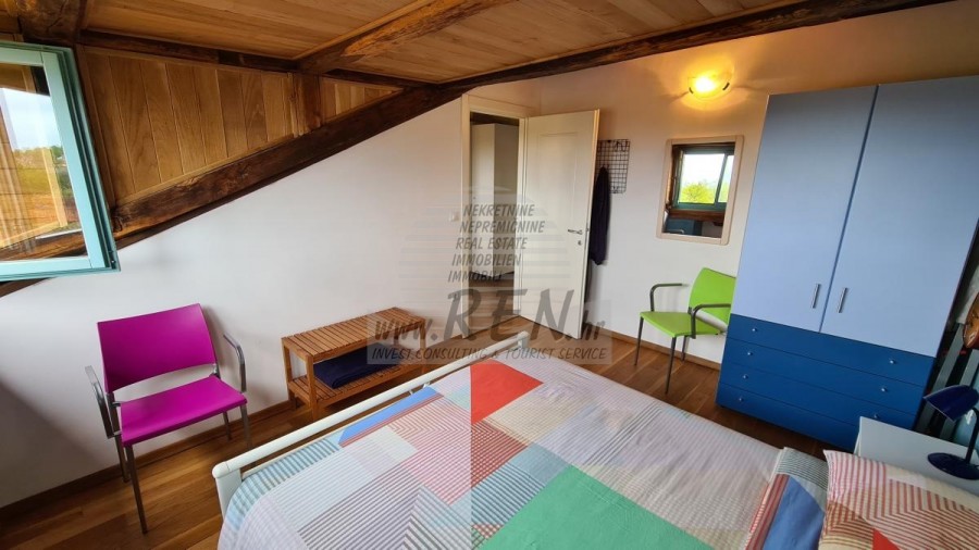Stan ima ukupno 91,33 m2, nalazi se na mansardi, izgrađen je 2012 godine, udaljen je 5 min. (5000m) od mora i od prekrasne uređene plaže, 10 min. (6000m) udaljeni ste od centra grada Poreča. Stan se sastoji od hodnika, kuhinje/blagovaone, dnevne sobe, 2 sobe, kupatilo, terasa. Opremljen je klima uređajem, vlastiti parking, prekrasan pogled na more. Mogučnost korištenja tenis terena te bazena.