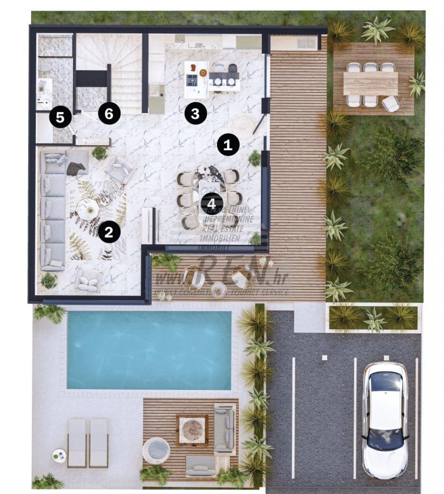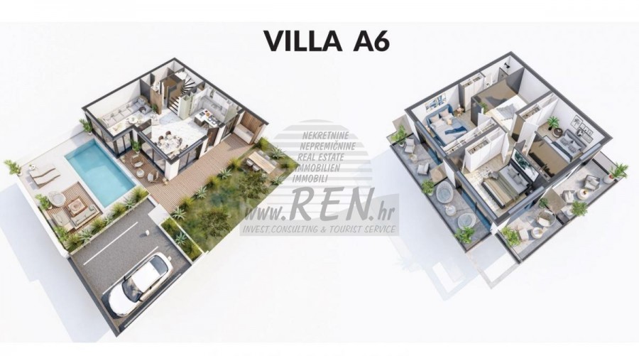 Kuća A6 ima ukupno 249,23 m2, zemljišta ima 323 m2, udaljena je 5 min. (100m) od mora i od prekrasne uređene prirodne plaže, 10 min. (6000m) udaljeni ste od centra Umaga. Kuća je dvojna te ima prizemlje i prvi kat. U izgradnji. Ukupno ima 3 spavaće sobe, kuhinja, dnevna soba, 3 kupatila, spremište. Kuća ima 2 vlastita parkinga, 2 terase sa prekrasnim pogledom na more, kamin, klima, bazen, luksuzno opremljena. U privatnom resortu sa recepcijom, mogućnost zajedničkog korištenja teretane, wellnessa, dječjeg igrališta, Wine Bar, 24 satni nadzor, stanica za punjenje električnih auta, dostupni paketi održavanja objekta.