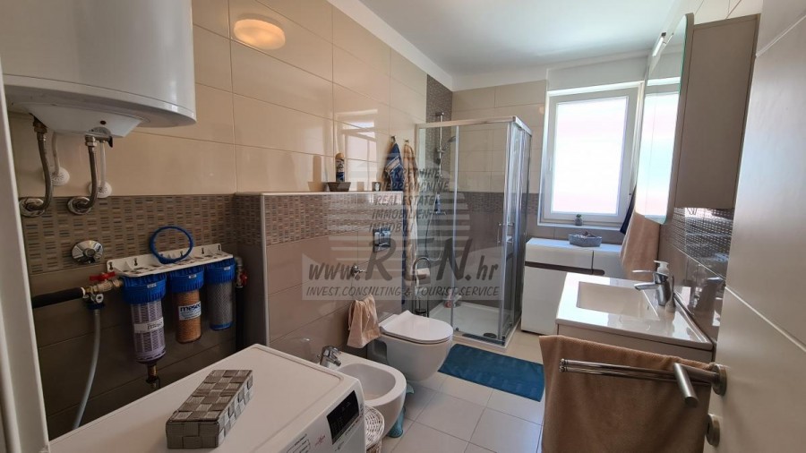 Stan u Novigradu ima ukupno 79,37 m2, nalazi se na prvom katu, udaljen je 5 min. (800m) od mora i od prekrasne uređene plaže, 5 min. (1000m) udaljeni ste od centra grada Novigrada. Stan se sastoji od kuhinje/dnevnog boravka/blagovaone, 2 spavaće sobe, kupaonica, terasa. Kompletno opremljen, klima uređaji, vlastiti parking, spremište u podrumu, prekrasan pogled na more.