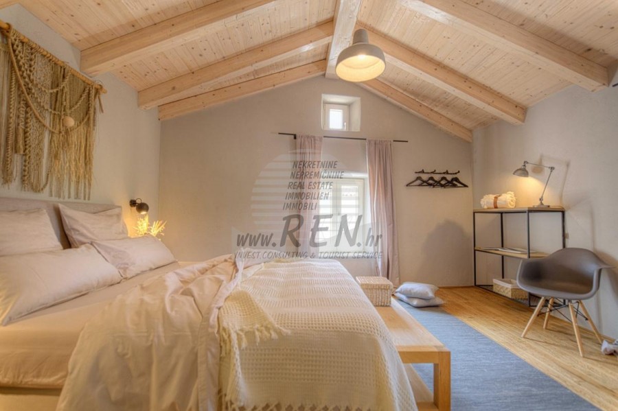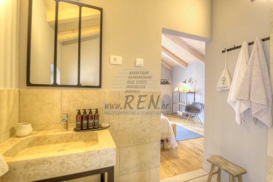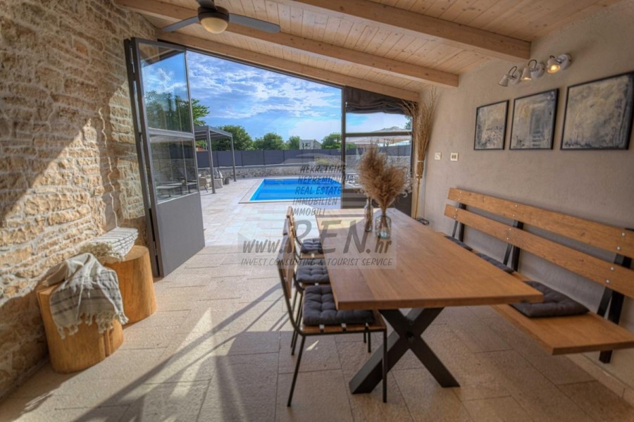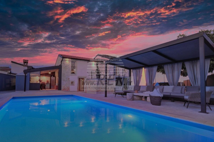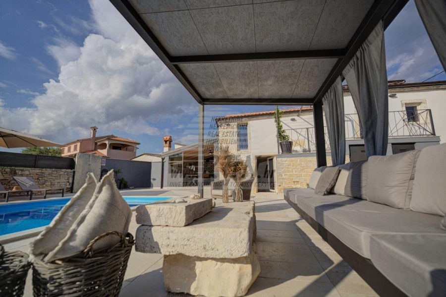 Vila ima ukupno 100 m2, zemljišta ima 450 m2, udaljena je 10 min. (10km) od mora i od prekrasne uređene prirodne plaže, 10 min. (10km) udaljeni ste od centra Kanfanara. Kuća je samostojeća, sastoji se od 2 kata. Ukupno ima 3 spavaće sobe, kuhinju, dnevnu sobu, 3 kupatila. Sve prostorije u vili su klimatizirane. Kuća ima vlastiti parking, bazen, ljetnu kuhinju,.