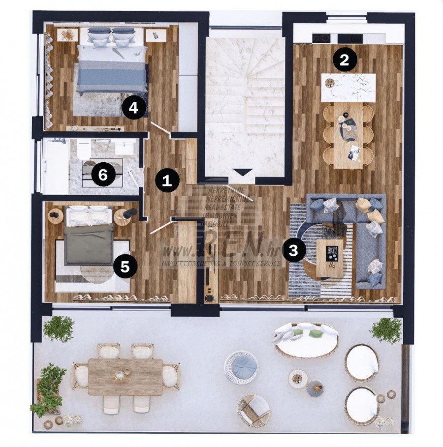 Stan ima ukupno 82,25 m2, terasa ima dodatnih 43,80 m2, udaljena je 5 min. (100m) od mora i od prekrasne uređene prirodne plaže, 10 min. (6000m) udaljeni ste od centra Umaga. Stan se nalazi na prvom katu. U izgradnji. Ukupno ima 2 spavaće sobe, kuhinja, dnevna soba, 1 kupatilo, spremište. Stan ima 2 vlastita parkinga, terasu, kamin, klima, luksuzno opremljen. U privatnom resortu sa recepcijom, mogućnost zajedničkog korištenja teretane, wellnessa, dječjeg igrališta, Wine Bar, 24 satni nadzor, stanica za punjenje električnih auta, dostupni paketi održavanja objekta.