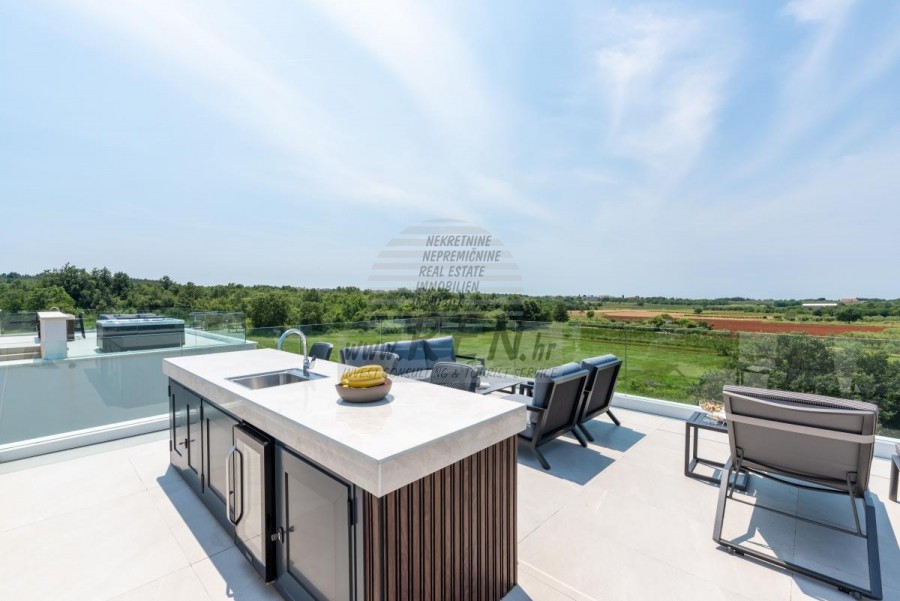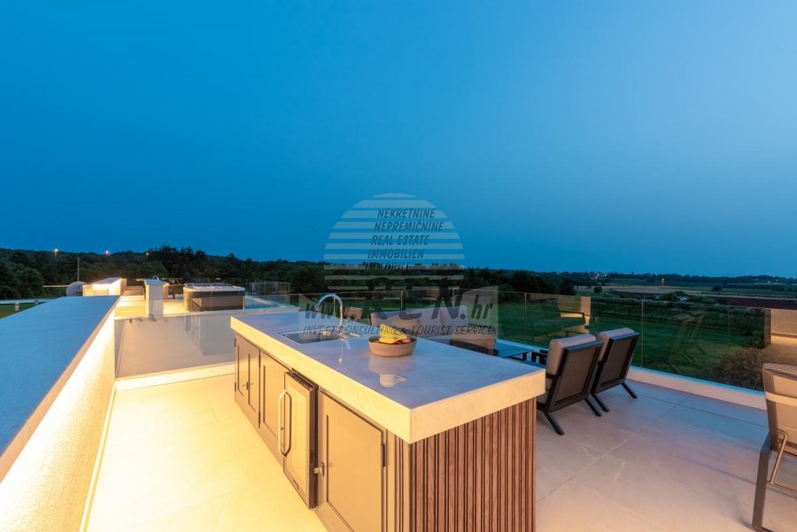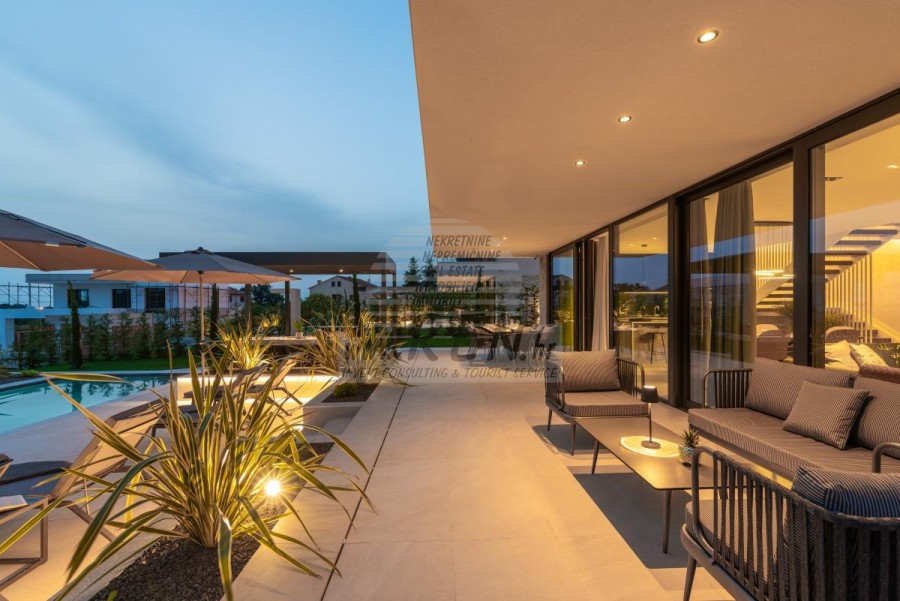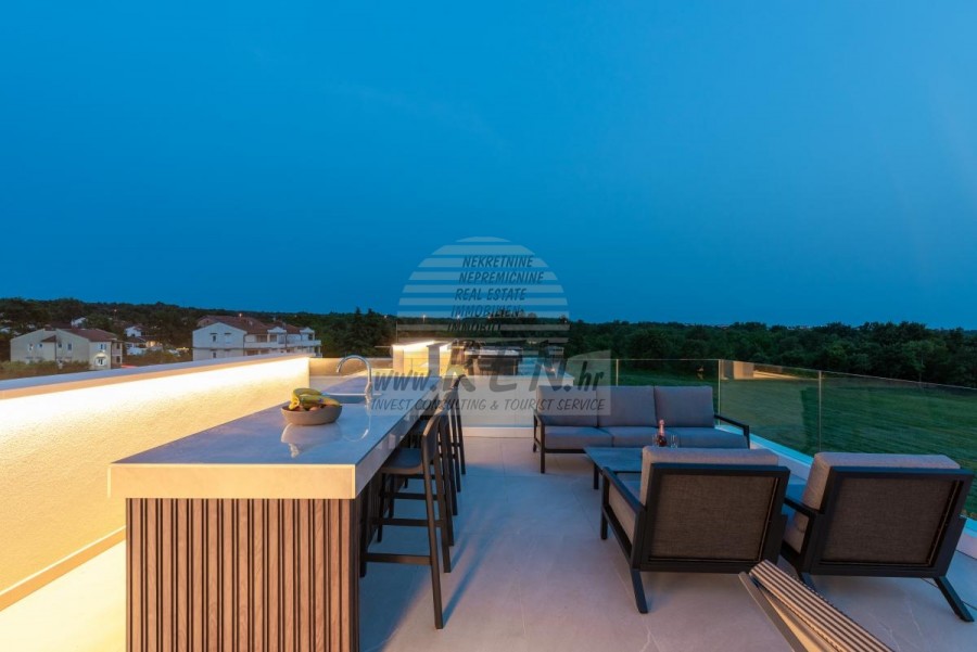 • Dnevni boravak je opremljen vrhunskim talijanskim namještajem marke Tomasella, Sedit-Italia, Veneta Cucine, a sjedeća garnitura je marke Natuzzi.