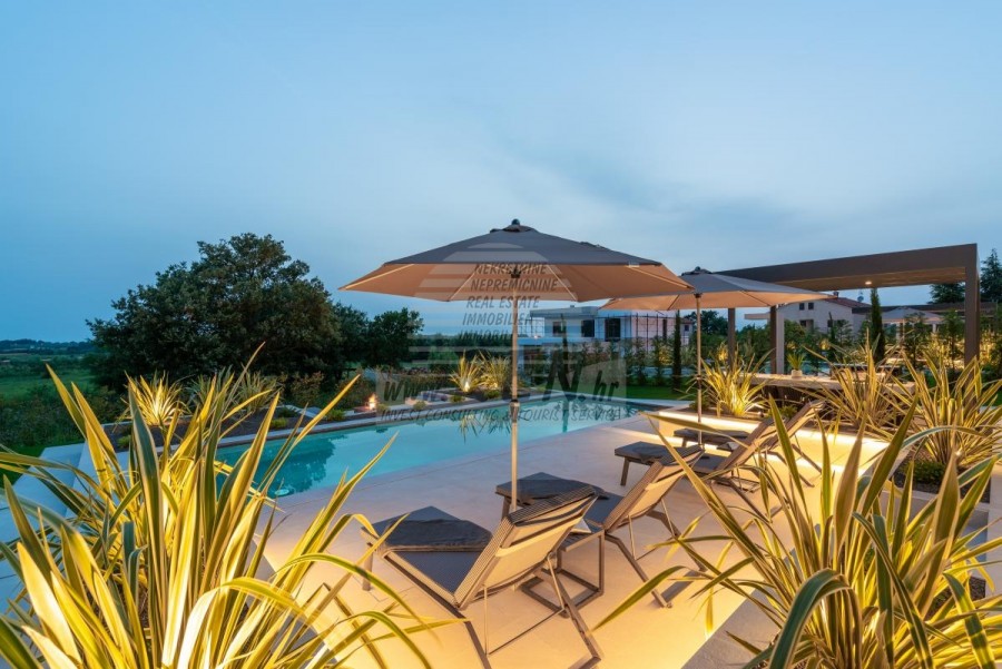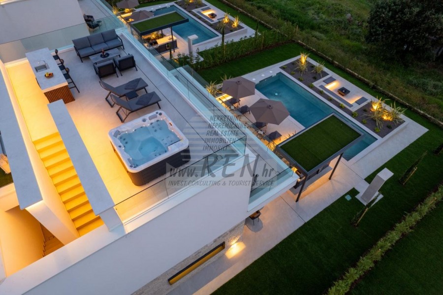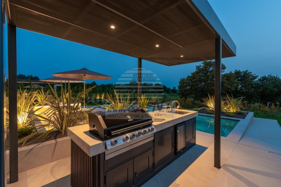 U okolišu je vanjski grijani bazen, sunčalište, natkrivena terasa za objedovanje, nadstrešnica sa ljetnom kuhinjom i nenatkrivena terasa neposredno uz bazen. U donjem dijelu dvorišta nalazi se Fire-pit. U sklopu dvorišta nalazi se i dizajnerski vanjski tuš s toplom vodom i podnim sifonom.