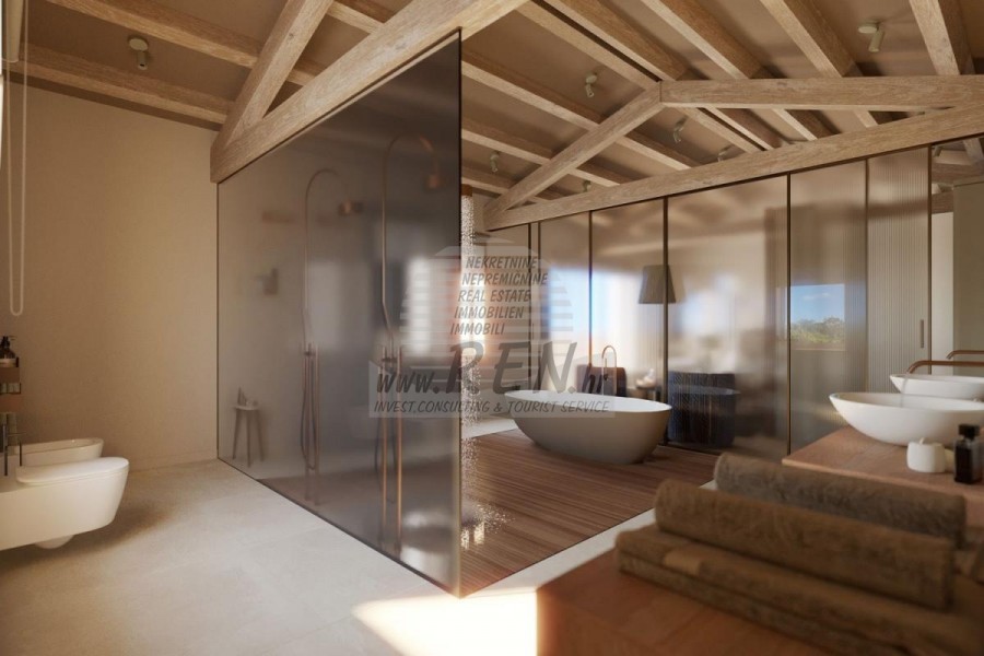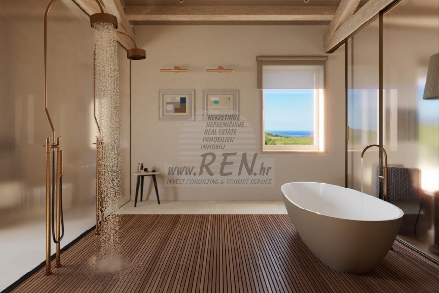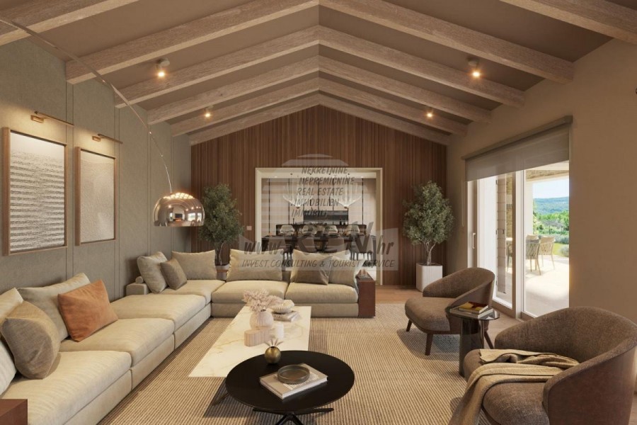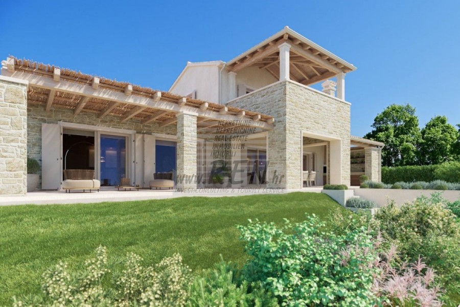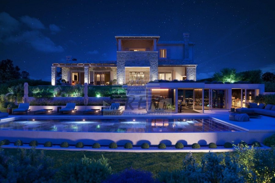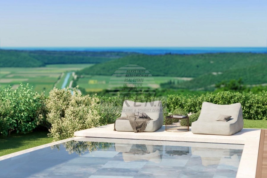 Luksuzna villa s jednim od najljepših pogleda u Istri nalazi se u mirnom i malom mjestu u okolici Buja, iz kojeg se pruža čaroban pogled od planine Učke, rijeke Mirne i mora te čak do Alpa. Plivajući u bazenu možete uživati u pogledu na dolinu rijeke Mirne, lovište i Motovunsku šumu poznatu po čuvenom Istarskom tartufu. Kompletno imanje od 1500 m2 ograđeno i udaljeno od ostalih kuća. Te je okruženo maslinikom. Imanje je novo sagrađeno u skladu sa ekološkim standardima, isključivo sa prirodnim materijalima kao što je kamen/drvo, okućnica je uređena isključivo sa domaćim biljkama, masline. Vila ima 3 spavaće sobe sa pripadajućim kupaonicama. Dnevni dio prostire se na 80m2, te obuhvaća luksuznu kuhinju sa otokom opremljenu najmodernijom suvremenom tehnologijom… tu je i blagovaonica, kao i dnevni boravak sa kaminom te prekrasnim pogledom na more, te ima dvoja francuska vrata koje vode na vanjsku terasu, sunčalište, bazen, ljetnu kuhinju i travnjak. U podrumu nalazi se Wellness te fitnes iz kojih se također pruža prekrasan pogled. Sav namještaj potpisuju dizajneri i rađen je po mjeri. Objek je opremljen sa najsuvremenijim sistemom centralnog grijanja i hlađenja, kao i solarnim panelima, a sve kupaonice imaju i podna grijanja. Bazen osim sunčališta, očaravajućih pogleda, mira nudi i posebno veliki vanjski tuš. Na imanju se nalazi i parking za pet automobila, kao i svi dodatni sadržaji kao što su; vanjski roštilj.