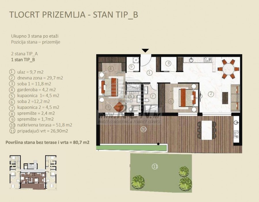 Stan 2 u Novigradu ima ukupno 80,7 m2 bez terase + 26 m2 vrta, nalazi se u prizemlju, faza gradnje, udaljen je 5 min. (1000m) od mora i od prekrasne uređene plaže, 5 min. (1000m) udaljeni ste od centra grada Novigrada. Stan se sastoji od kuhinje/dnevnog boravka/blagovaone, 2 sobe, 2 kupatila, 2 spremišta, garderoba, terasa 51,80 m2. Specifičnosti stana: