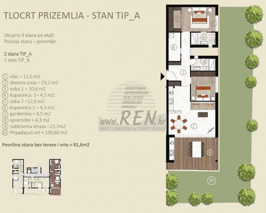 Stan 3 u Novigradu ima ukupno 81,6 m2 bez terase + 130 m2 vrta, nalazi se u prizemlju, faza gradnje, udaljen je 5 min. (1000m) od mora i od prekrasne uređene plaže, 5 min. (1000m) udaljeni ste od centra grada Novigrada. Stan se sastoji od kuhinje/dnevnog boravka/blagovaone, 2 sobe, 2 kupatila, spremišta, garderoba, terasa 23,70 m2. Specifičnosti stana: