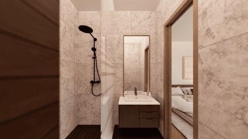 Prizemlje: Sastoji se od ulaznog prostora, jedne spavaće sobe, moderne kupaonice, funkcionalne kuhinje te prostranog dnevnog boravka sa staklenom stijenkama koje vode direktno na vanjski dio s bazenom.