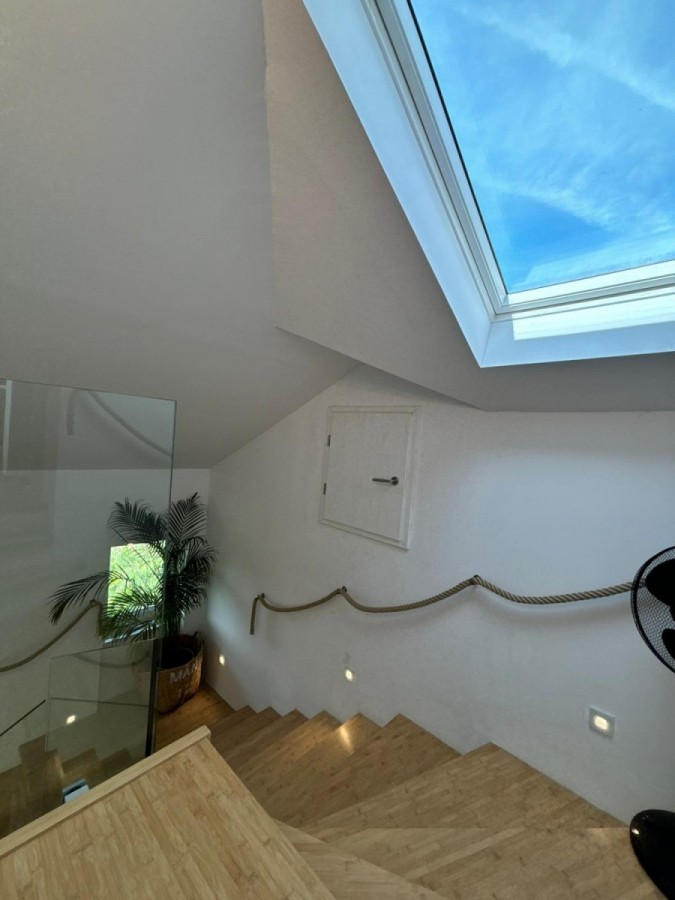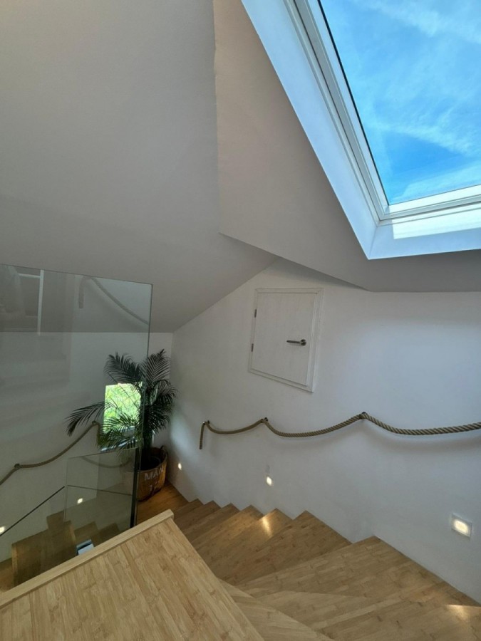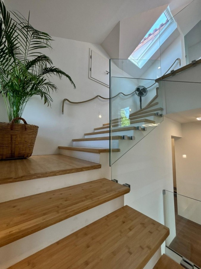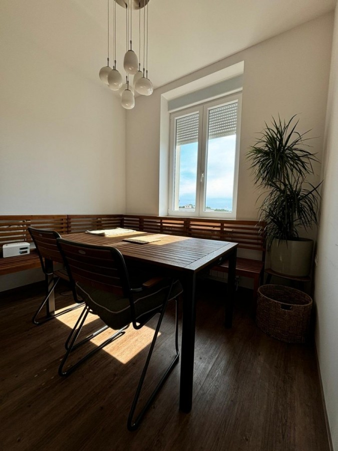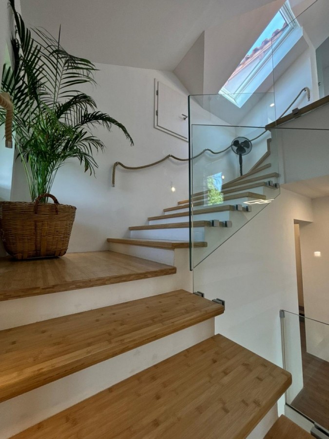 Potkrovlje: dvije komforne sobe, moderna kupaonica s kadom i tušem, terasa s panoramskim pogledom na šumu i more.