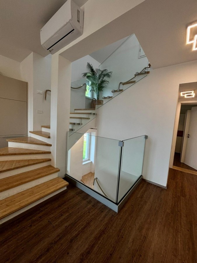 Prvi kat: prostran dnevni boravak otvorenog koncepta, moderna kuhinja s blagovaonicom, spavaća soba, kupaonica, izlaz na veliku terasu s pogledom na zelenilo.