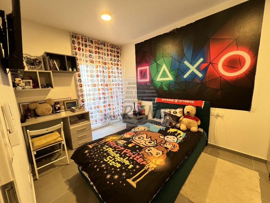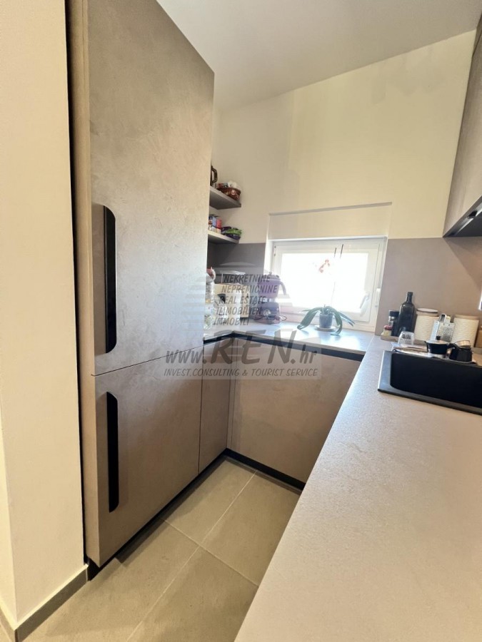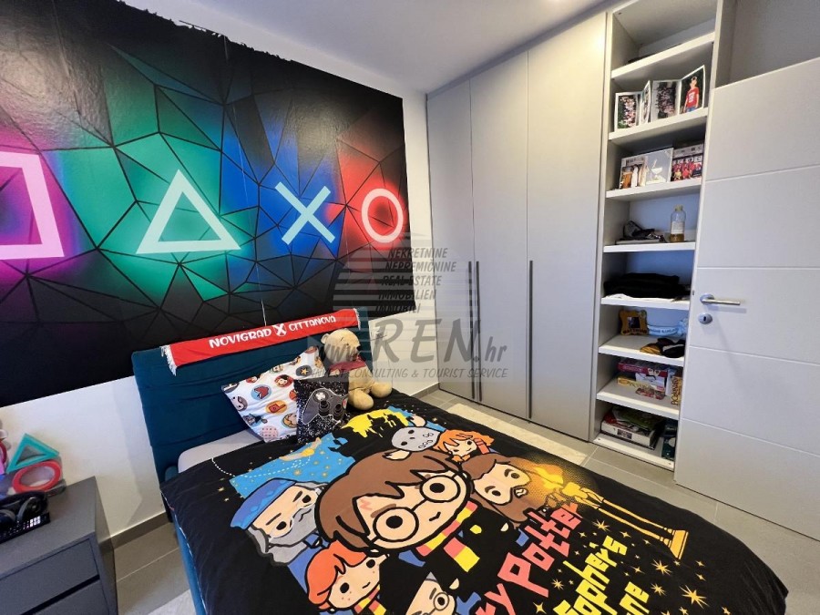 Prodaje se atraktivan stan na 3 etaže u Novigradu. Stan se nalazi na mirnoj lokaciji i udaljen je 1700 m od centra grada i 1300 m od mora i lijepo uređene plaže. Stan ima 129 m2 i sastoji se od prizemlja, 1. kata i 2. kata. U prizemlju se nalazi ulazni hodnik, wc, te open space prostor u kojem je smještena kuhinja s blagovaonicom i dnevni boravak s izlazom na vrt. Na 1. katu nalaze se 2 spavaće sobe od kojih jedna ima izlaz na balkon, kupatilo te dodatna soba. Na 2. katu smještena je velika spavaća soba s kupatilom, spremište te krovna terasa s lijepim pogledom na more. Stan je moguće koristiti u stambene ili turističke svrhe. Stanu pripadaju 2 parkirna mjesta. Stan se prodaje kompletno namješten.